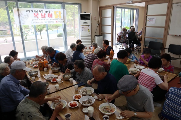 이번 나눔 행사는 인천공항공사에서 후원하고 인천시사회복지공동모금회에서 지원한 가운데 LH7단지 내 어르신들에게 사랑의 복날 특식으로 삼계탕을 무료로 대접했다.