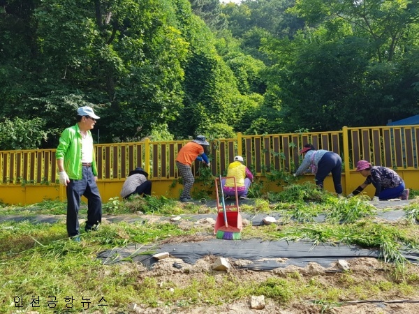 이날 12명의 용유동 어르신들은 원아들이 등원하기 전 어린이집 주변에 자라난 잡초를 제거하고 주말동안 관광객이 버리고 간 쓰레기를 수거하는 등 비지땀을 흘렸다.