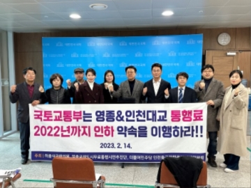 한편, 시민추진단 김요한 영종국제도시 총연합회 정책위원장은 “국토교통부가 고금리 핑계를 대며 약속했던 영종·인천대교 통행료 인하를 미루고 있다”며 “국민들에게 약속한 통행료 인하 약속이 조속히 지켜지지 않는다면 영종국제도시 주민들의 집단 행동을 피할 수 없을 것”이라고 말했다.