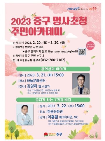 이번 명사초청 주민 아카데미는 중구 주민이면 누구나 신청할 수 있으며, 중구 홈페이지에서 신청할 수 있다. 궁금한 사항은 중구청 총무과(032-760-7167)로 문의하면 된다.