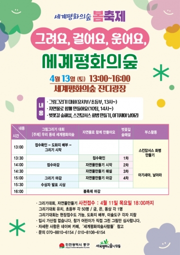 세계평화의 숲 사람들 이기혜 대표는 “새봄을 맞아 벚꽃이 만개한 세평숲에서 주민들과 함께 숲이 주는 즐거움을 만끽할 수 있는 봄축제를 마련했다”며 “많은 분들이 함께해 봄의 기운을 듬뿍 받아가시길 바란다”고 말했다.