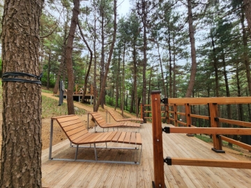 맨발산책길이 끝나고 몇 분을 더 걷자 백운산 자락 넓은 부지에 나무로 만든 여러 곳의 쉼터가 보인다. 중구에서 조성해 최근 개장식을 연 백운산 치유림이다. 파고라도 있고 야외테이블과 넓은 데크도 마련되어 있다. 곳곳을 연결하는 산길은 맨발로 걷는 흙길을 조성해 놓았다. 치유림에서 여유롭게 숲캉스를 즐기는 사람들이 드문드문 보였다.