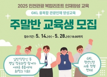 인천시는 인천관광공사, 그랜드코리아레저(이하 GKL)와 함께 오는 5월 31일부터 6월 22일까지 매주 주말마다 ‘2025 인천 복합리조트 인재양성교육(GKL 융복합 관광인재 양성교육) 주말반’을 특별 편성해 운영한다고 밝혔다.