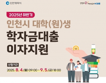 신청 시간은 2025년 8월 4일부터 9월 5일까지이며, 인천시 누리집(www.incheon.go.kr)의 ‘학자금대출 이자 지원 신청’ 게시판에서 구비서류를 첨부해 온라인으로 신청할 수 있다.