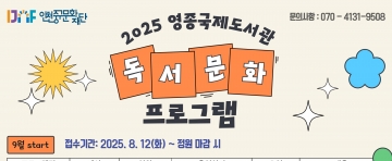 이번 독서 문화 프로그램은 영종복합문화센터에 위치한 영종국제도서관(중구 찬들로 151)에서 진행되며, 운영 일정과 참여 대상 등 프로그램의 세부 내용은 인천중구문화재단 누리집에서 확인할 수 있다.