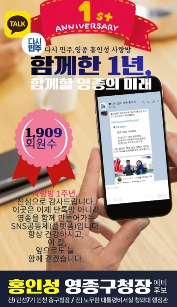 ‘다시 민주, 영종 홍인성 사랑방’이 이달 5일부로 1주년을 맞이했다. ‘다시 민주 영종 홍인성 사랑방’은 지난해 4월 5일 홍인성 전 중구청장을 사랑하는 사람들이 모여 시작하여 현재 회원 수 1,909명이 활동하고 있다.