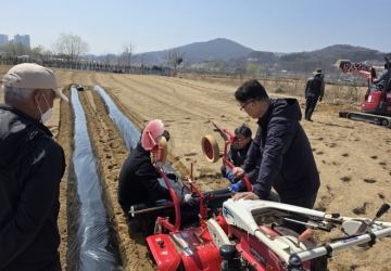 봄기운이 완연한 중산동 서당골 들녘. 새싹이 돋아난 밭 한편에서는 농기계 조작법을 배우려는 초보 농부들의 열기가 뜨겁게 달아올랐다.